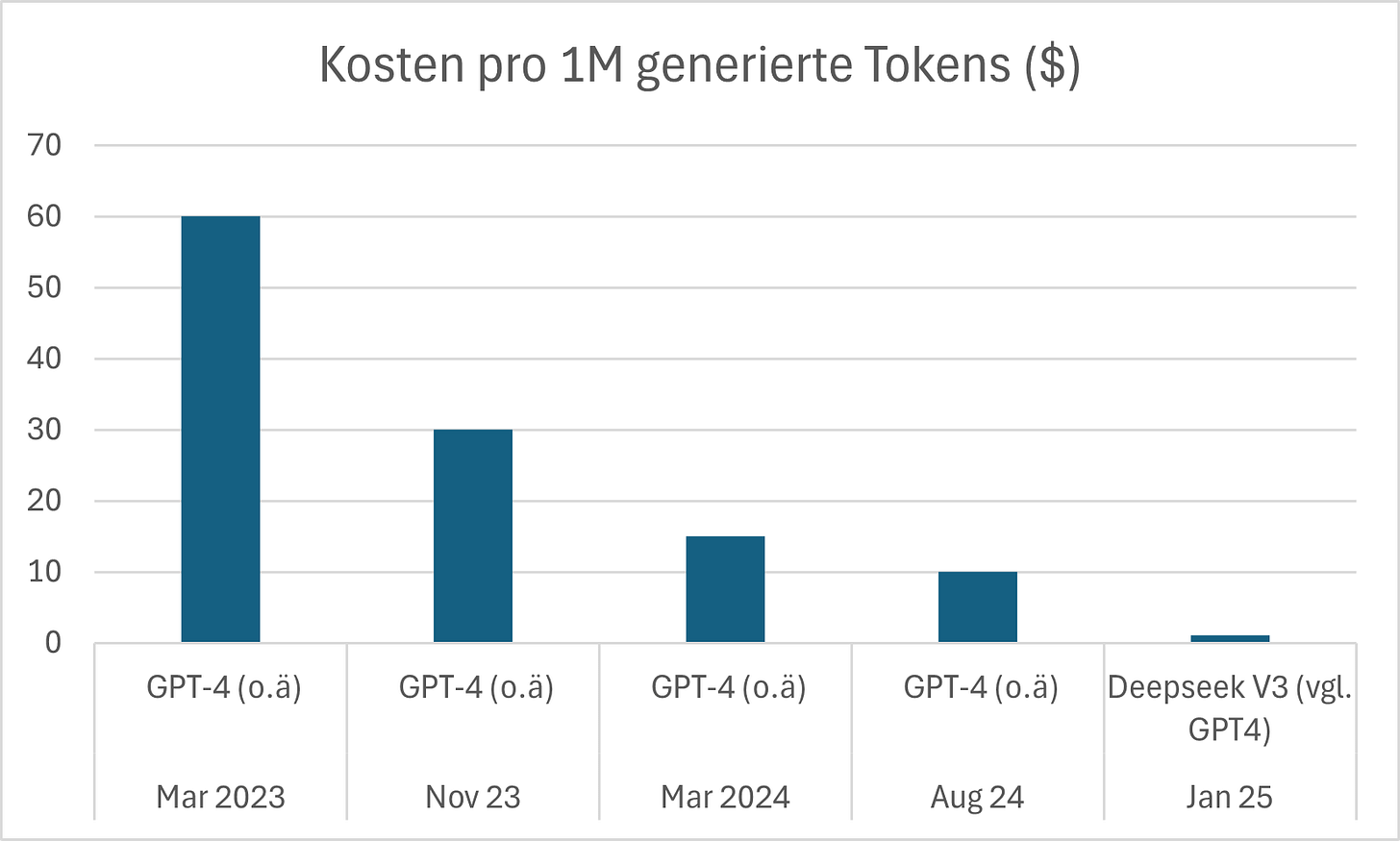 Seit der Veröffentlichung von GPT-4 haben sich die Preise pro 1 Million generierte Tokens (ca. 500.000 deutsche Wörter) um das Sechsfache reduziert â von ursprĂŒnglich 60 USD auf jetzt nur noch 10 USD. Wir gehen davon aus, dass die Kosten fĂŒr KI weiter stark sinken werden. Bereits heute zeigt sich das an Modellen wie DeepSeek V3, das eine vergleichbare Leistung wie GPT-4o bietet, aber mit nur 1,10 USD noch einmal fast zehnmal gĂŒnstiger ist.