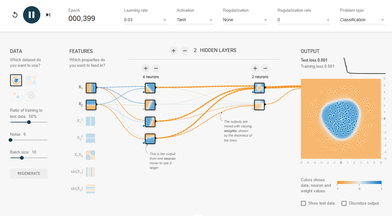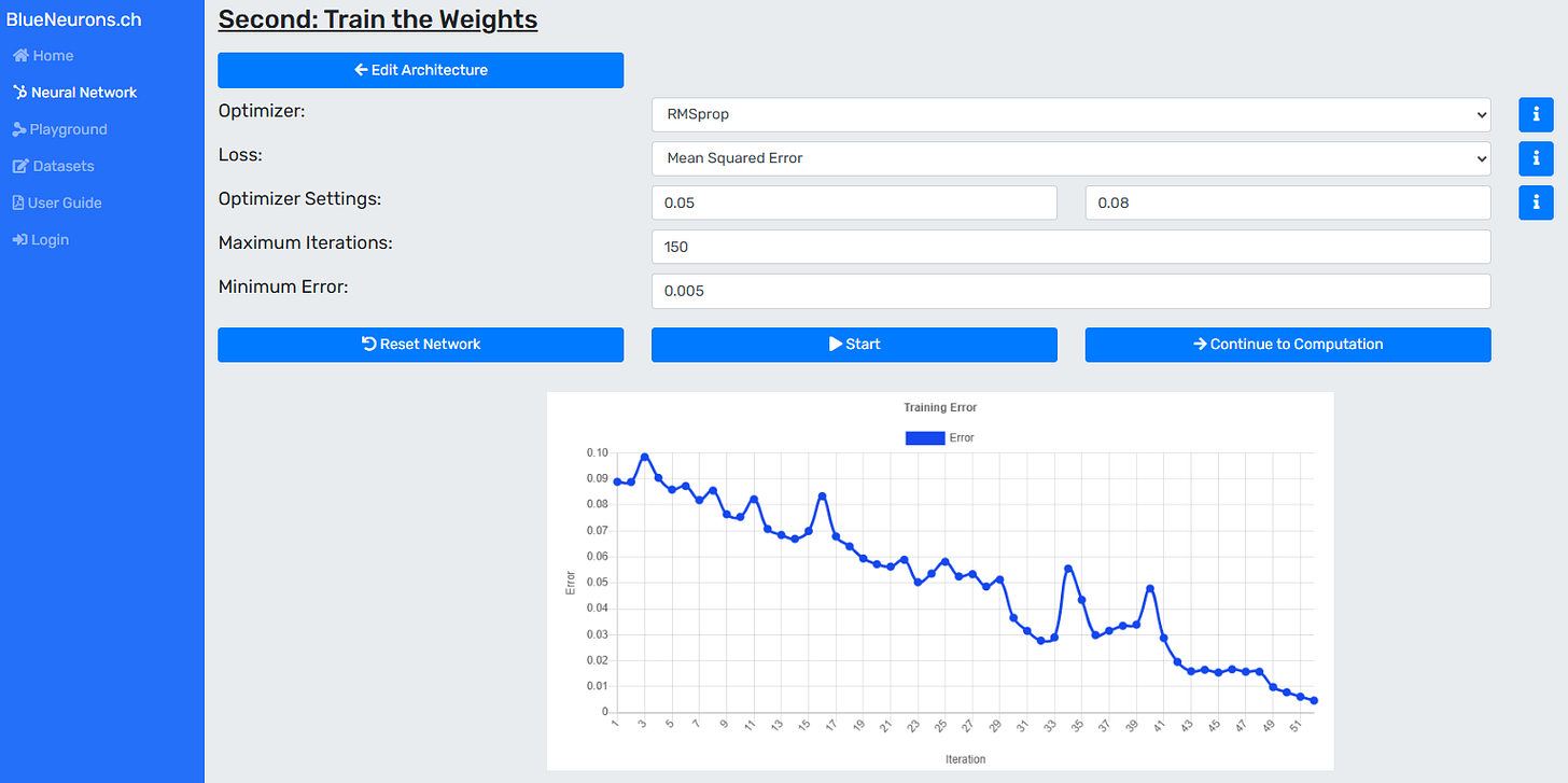 Experimentiere mit einem neuronalen Netzwerk in Echtzeit: WÀhle Daten, verÀndere die Architektur und beobachte direkt, wie sich das Netzwerk beim Lernen verhÀlt. Perfekt, um die Grundlagen spielerisch zu verstehen.
