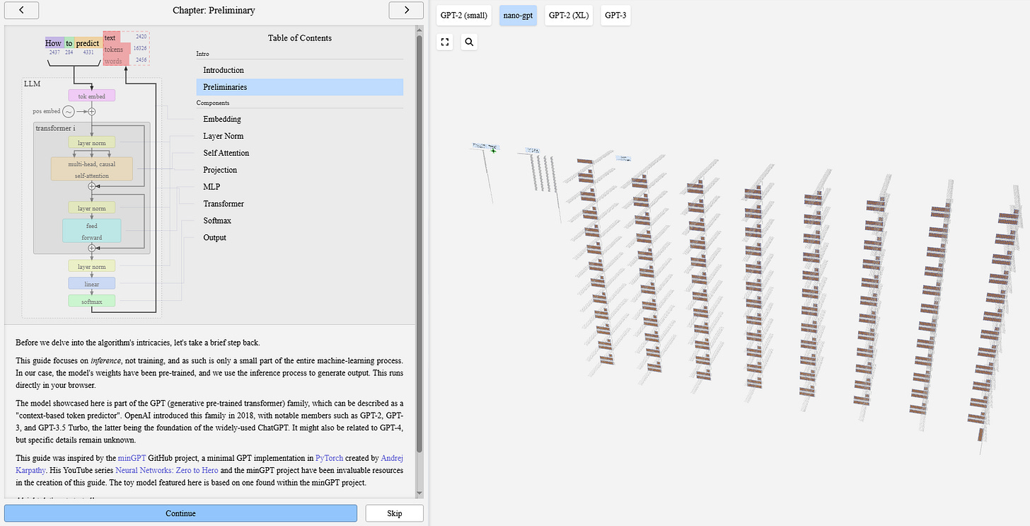 Erlebe eine interaktive Visualisierung eines Large-Language-Modells in 3D. Ein verstĂ€ndlicher Walkthrough erklĂ€rt Schritt fĂŒr Schritt wie ChatGPT Wörter verarbeitet und das nĂ€chste passende Wort auswĂ€hlt.