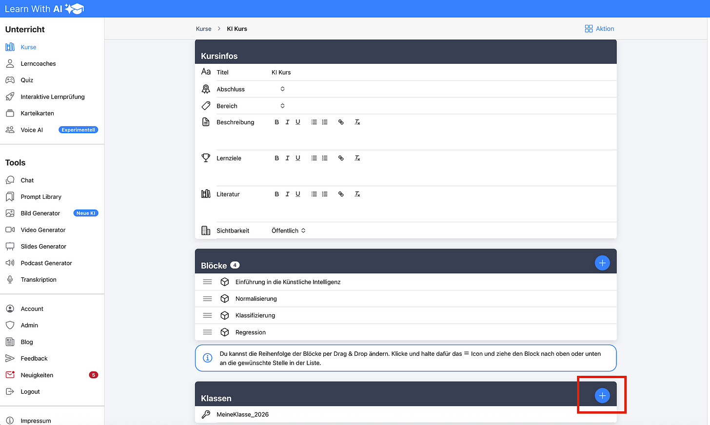 - Kursblock hinzufügen – z.B. „Einführung in die Künstliche Intelligenz”