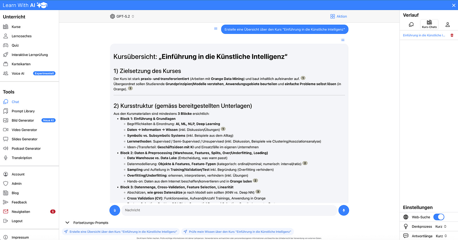Lege einen privaten Kurs an und nutze ihn wie ein Projekt. Sammle deine Materialien, lass dir Zusammenfassungen erstellen, prüfe Inhalte auf Aktualität oder entwickle neue Aufgaben – alles im Dialog mit deinen eigenen Unterlagen.