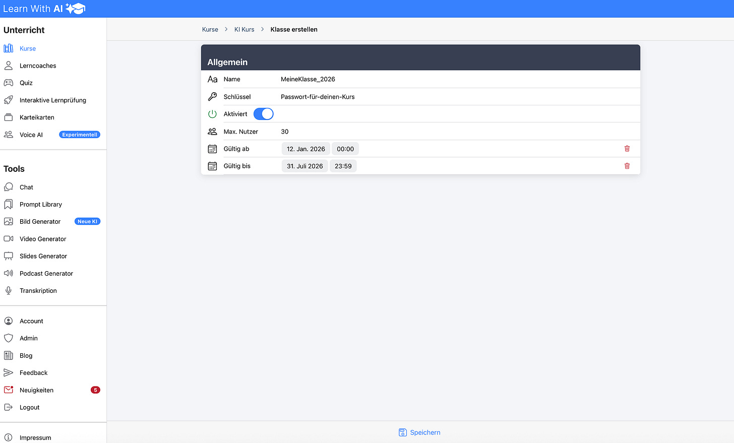 Zugriff steuern: Über Klassen legst du fest, wer wann Zugang erhält. Name, Passwort, maximale Nutzeranzahl und Gültigkeitszeitraum – alles einstellbar.