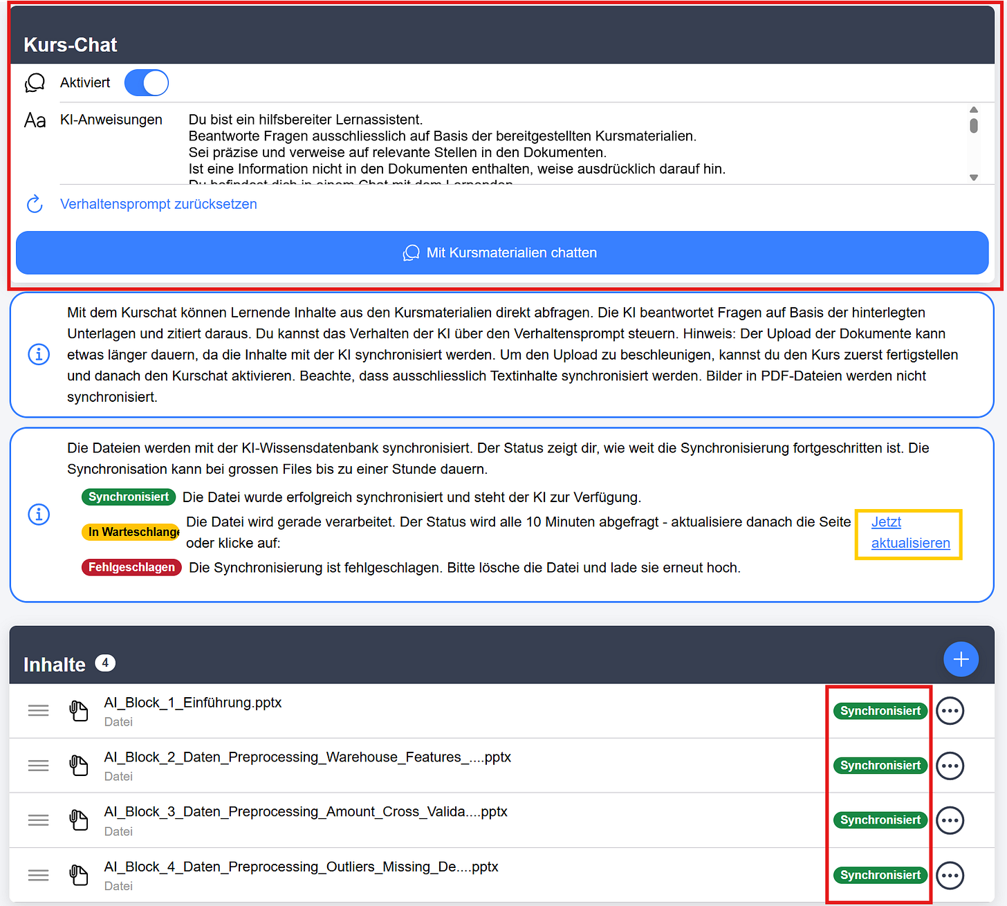 💡 Tipp: Lade alle Dateien hoch, bevor du den Kurschat aktivierst. So wird alles in einem Schritt synchronisiert – das spart Zeit.