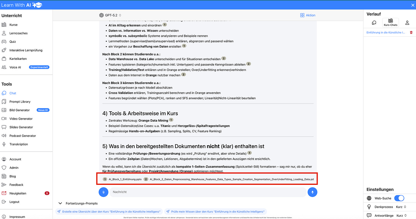 Der Kurschat zeigt an, aus welchen Dokumenten eine Information stammt. So können Lernende nachvollziehen, worauf sich Aussagen beziehen und du behältst die Kontrolle darüber, was vermittelt wird.