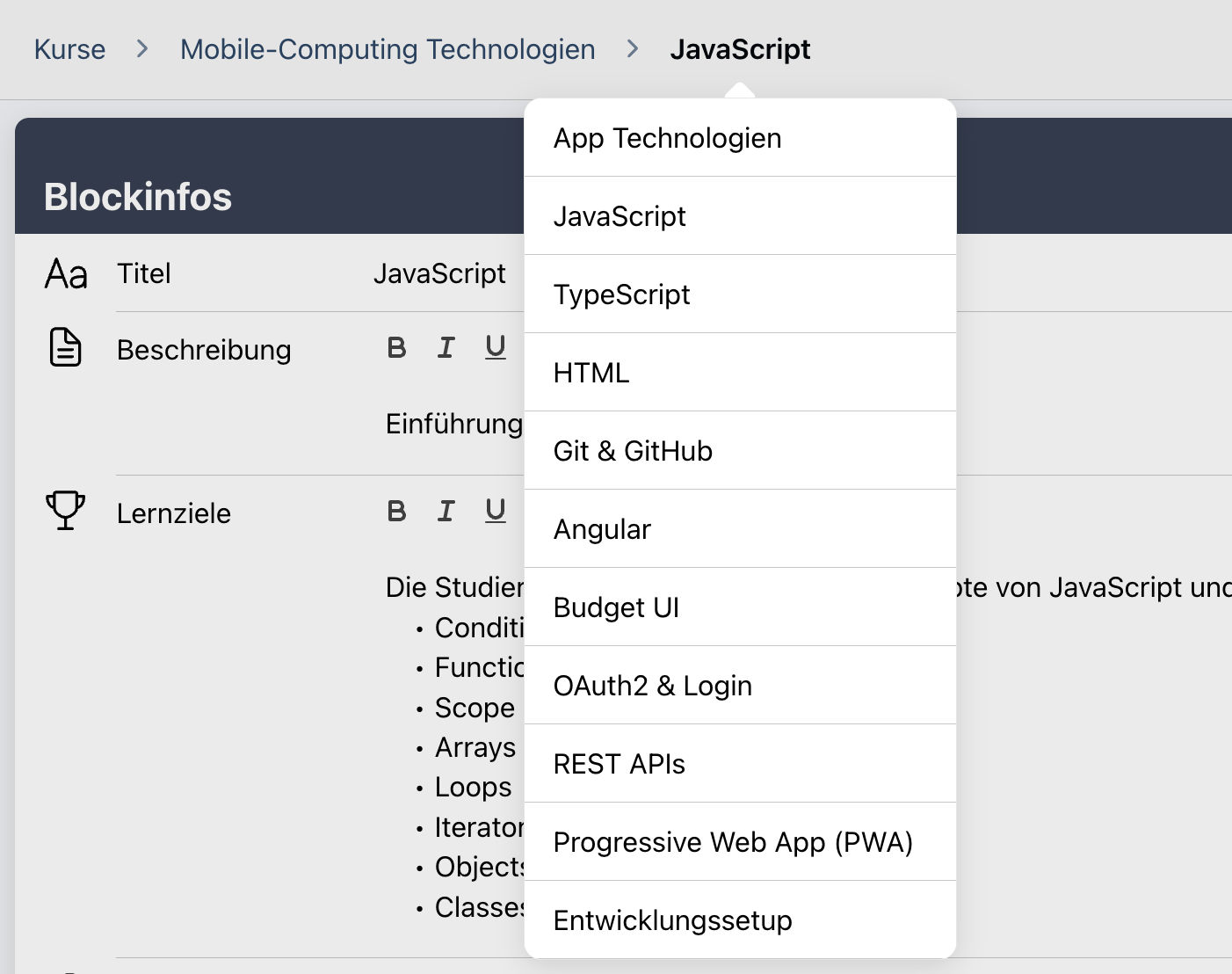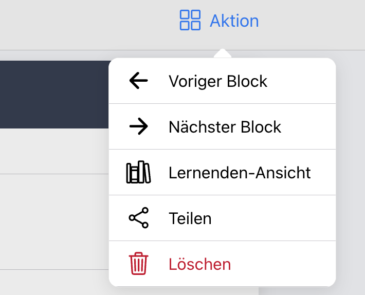 Um eine Liste aller Blöcke in dem Kurs anzuzeigen, kannst du mit der Maus über den Titel des aktuellen Blocks in der Kopfleiste fahren. Ein Klick auf einen Block in der Liste öffnet diesen direkt: