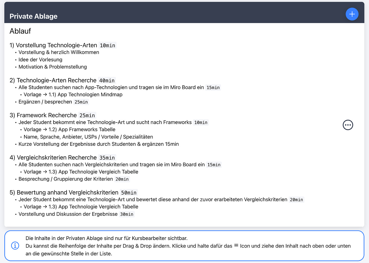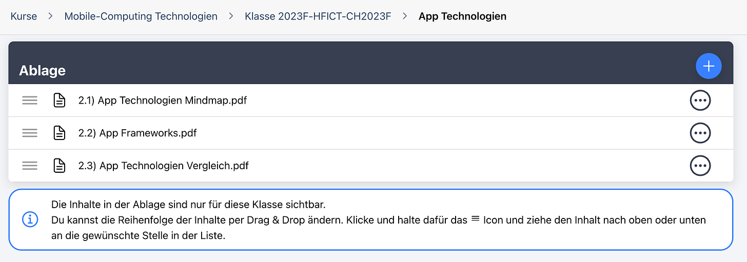 - Private Ablage: Speichere deine Unterrichtsnotizen, Musterlösungen oder Zusatzmaterialien direkt im Kurs. Alles bleibt für Lernende unsichtbar und ist nur für dich und Mitbearbeiter zugänglich.