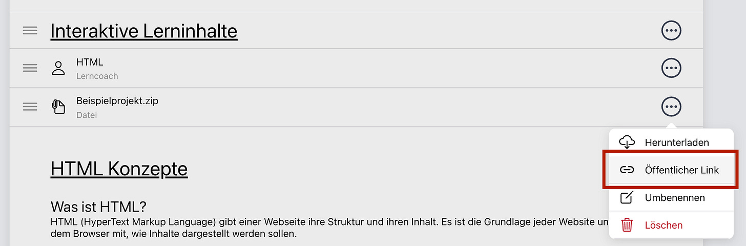 - Öffentliche File-Links: Teile Dateien aus deinem Kurs unkompliziert per Link, z. B. für Aufgabenstellungen, schnellen File-Transfer oder um Materialien direkt in einen Lerncoach einzubinden.