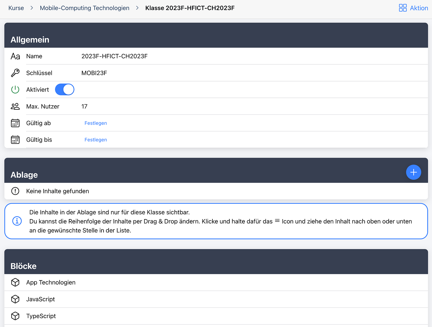 Der Klick auf einen Block führt zur Ablage für einen Kurs-Block: