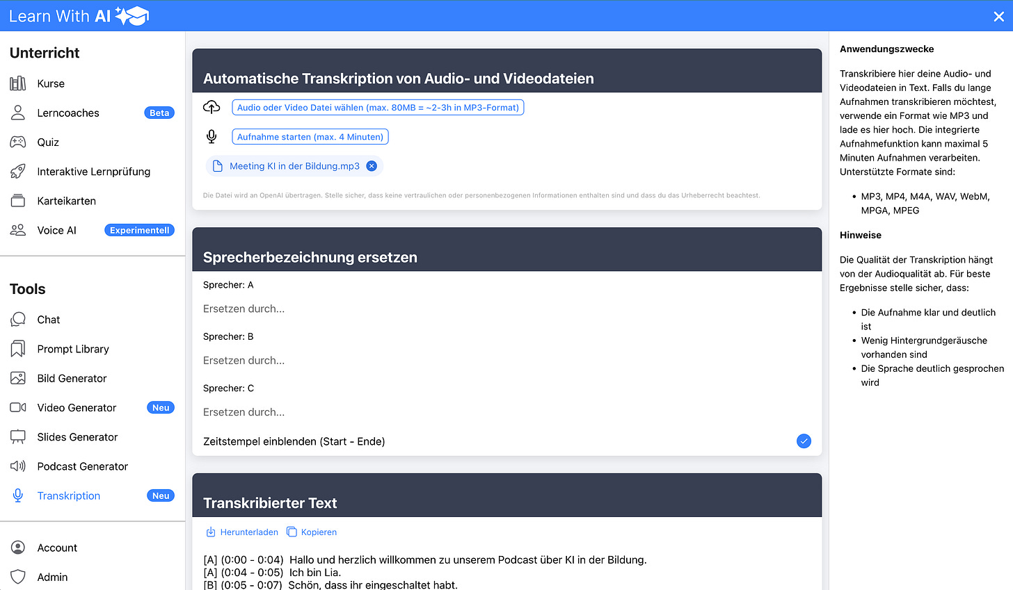 - KI-gestützte Lerninhalte (z. B. Quizfragen oder Rollenspiele) können direkt aus Transkripten generiert werden