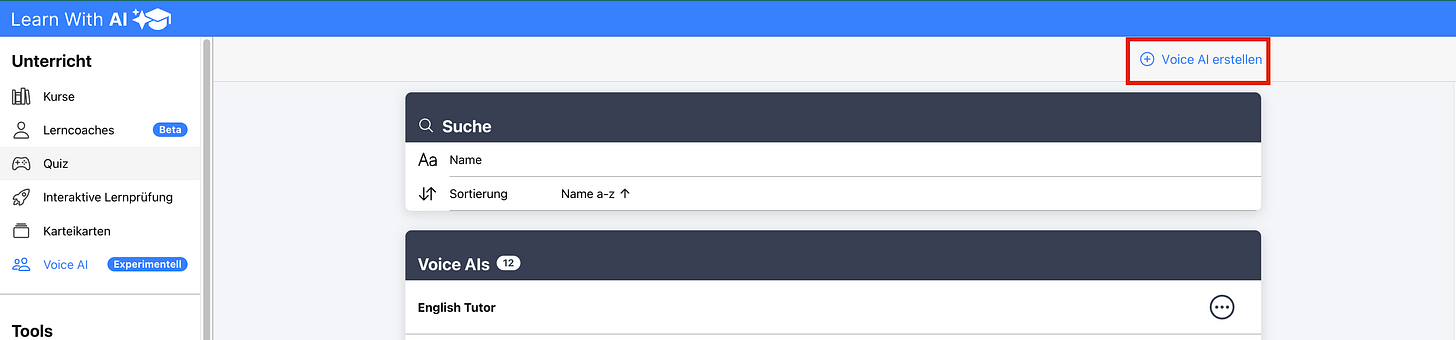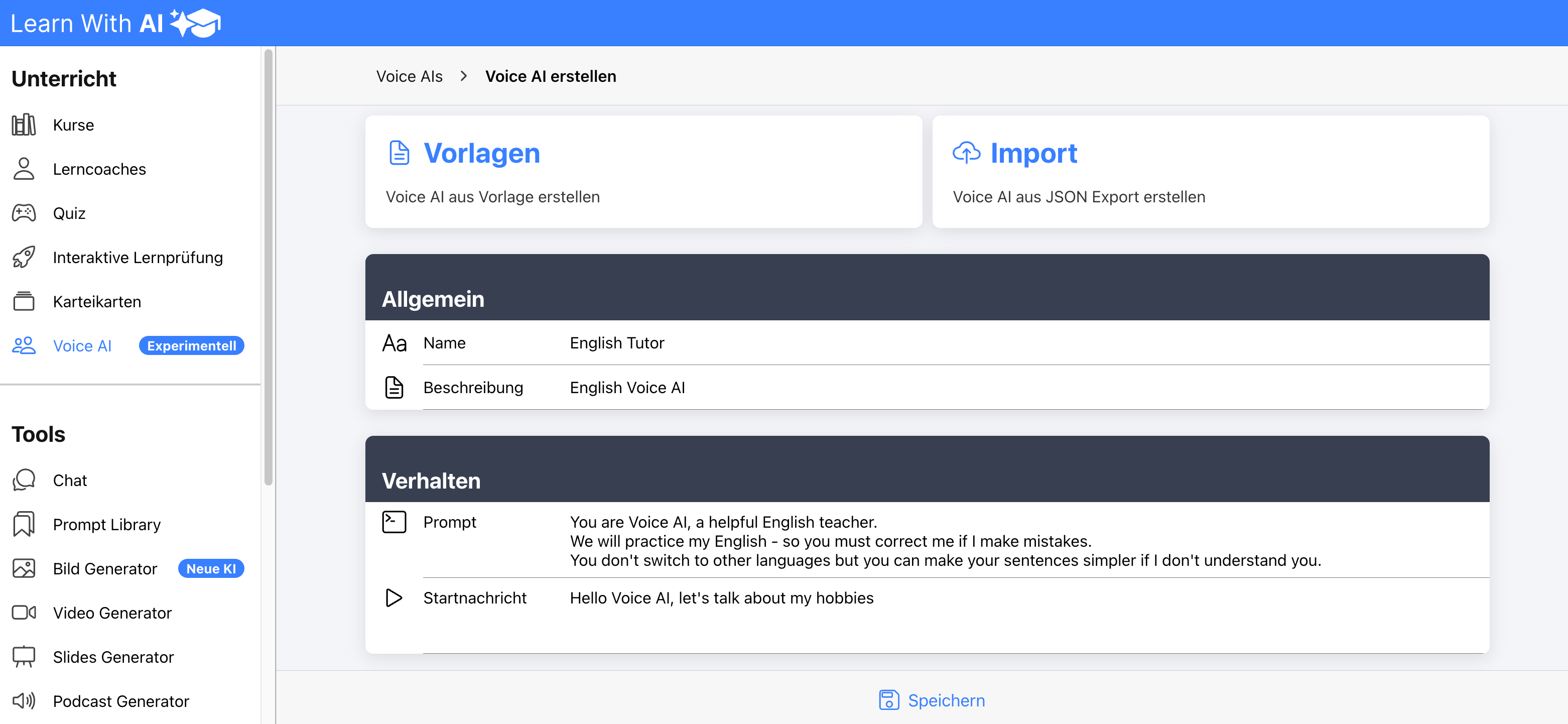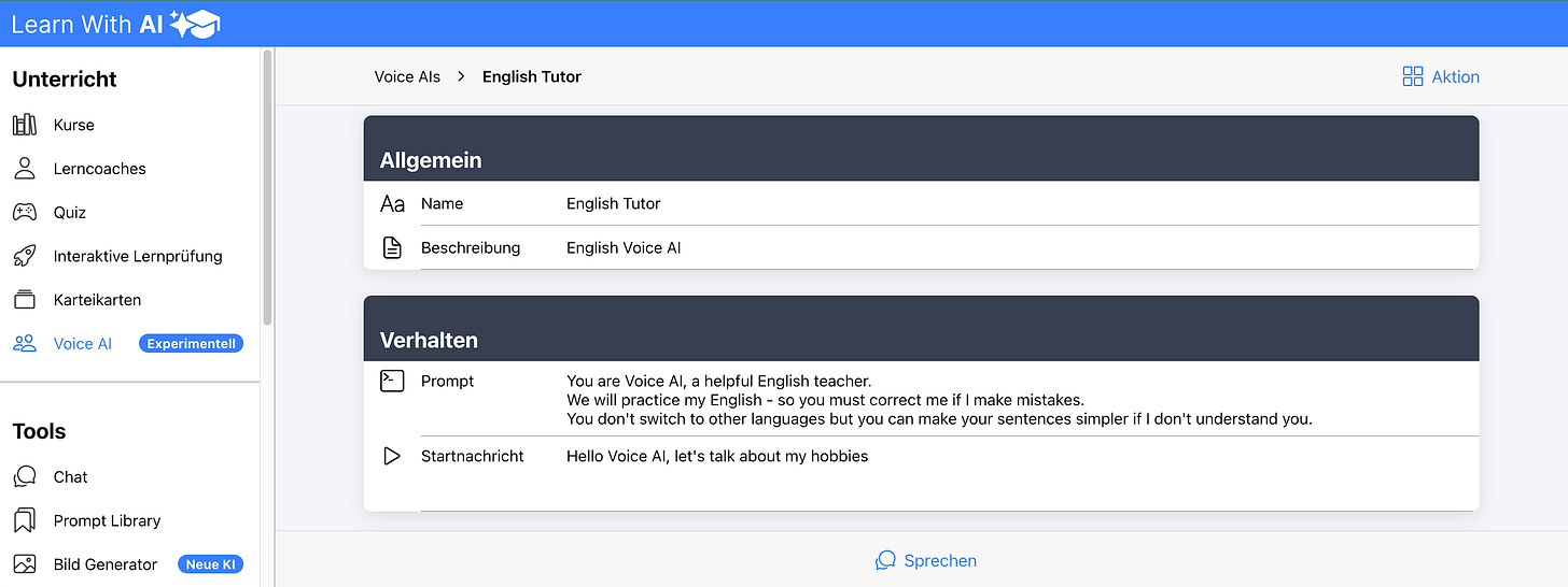 Mit Voice-AI in Learn-With.AI erstellst du eigene sprechende KI-Agenten, die gezielt auf Fach, Sprachniveau und Lernziele abgestimmt sind.