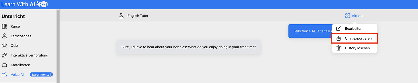 - 🧠 Mündliche Lernprüfungen – mündliche Prüfungssituationen authentisch simulieren z.B. für die Vorbereitung auf Abschlussprüfungen.