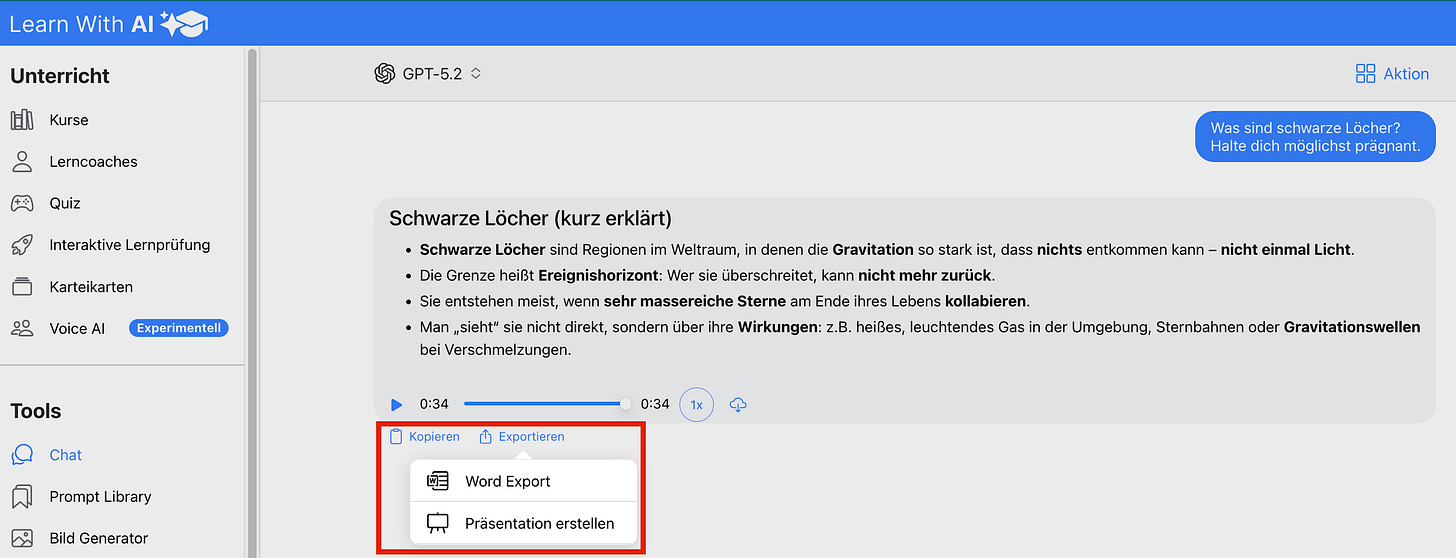 Imagine: You let the AI summarize a topic for you, listen to the summary, download it as an audio file for your learners — and immediately export the text as a presentation for the lesson. Everything in one step, straight from the chat.