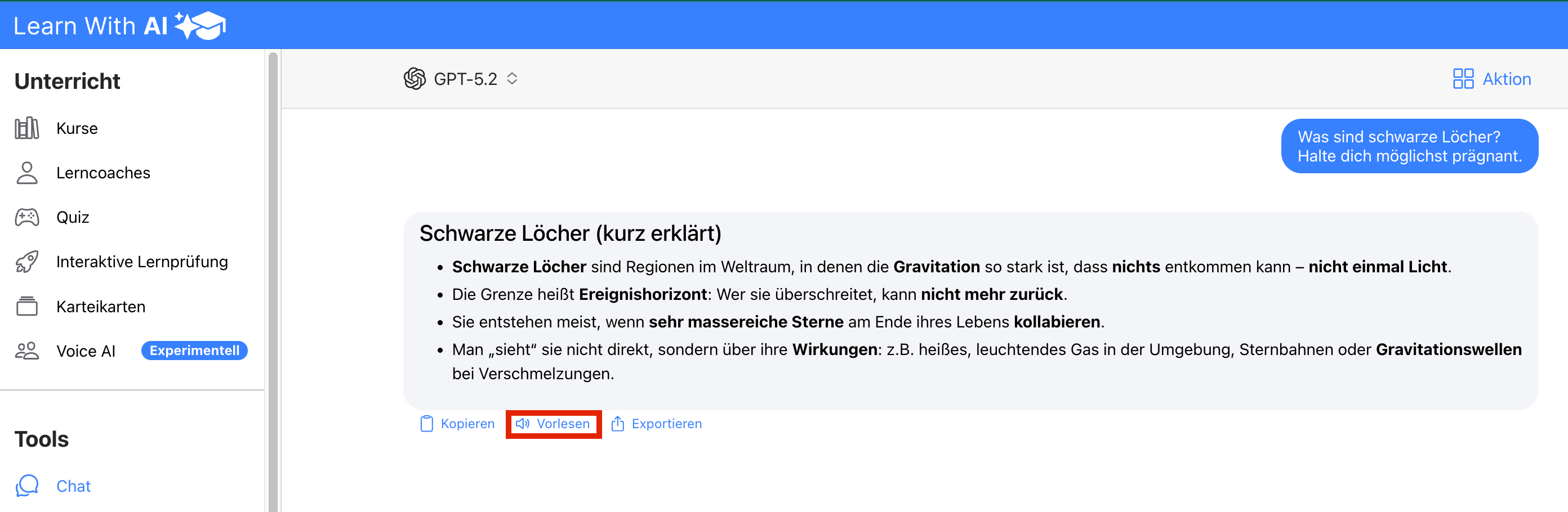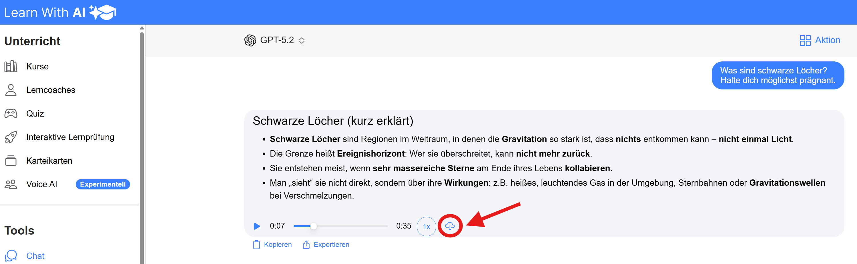 Read aloud — Click on “Read aloud” and the answer is read out directly. Using the download button, you can download the generated audio file and use it for your lessons — for example as a listening comprehension exercise, as an audio summary for exam preparation or as input for learners who prefer to listen to content rather than read it.
