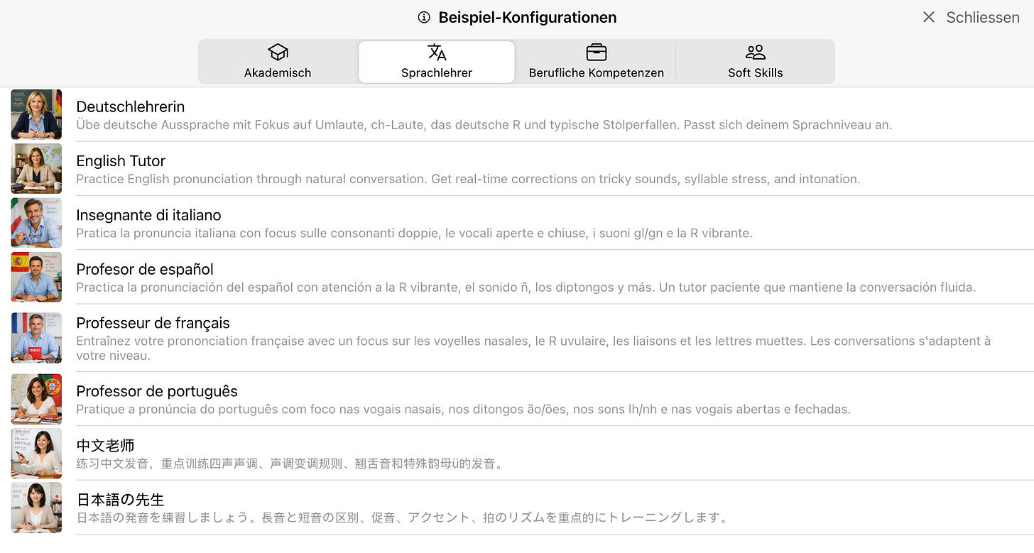 To help you get started even faster and have examples available, 25 additional Voice AI templates are now available. This includes templates from the areas of language teacher, professional competencies, soft skills and academic scenarios.