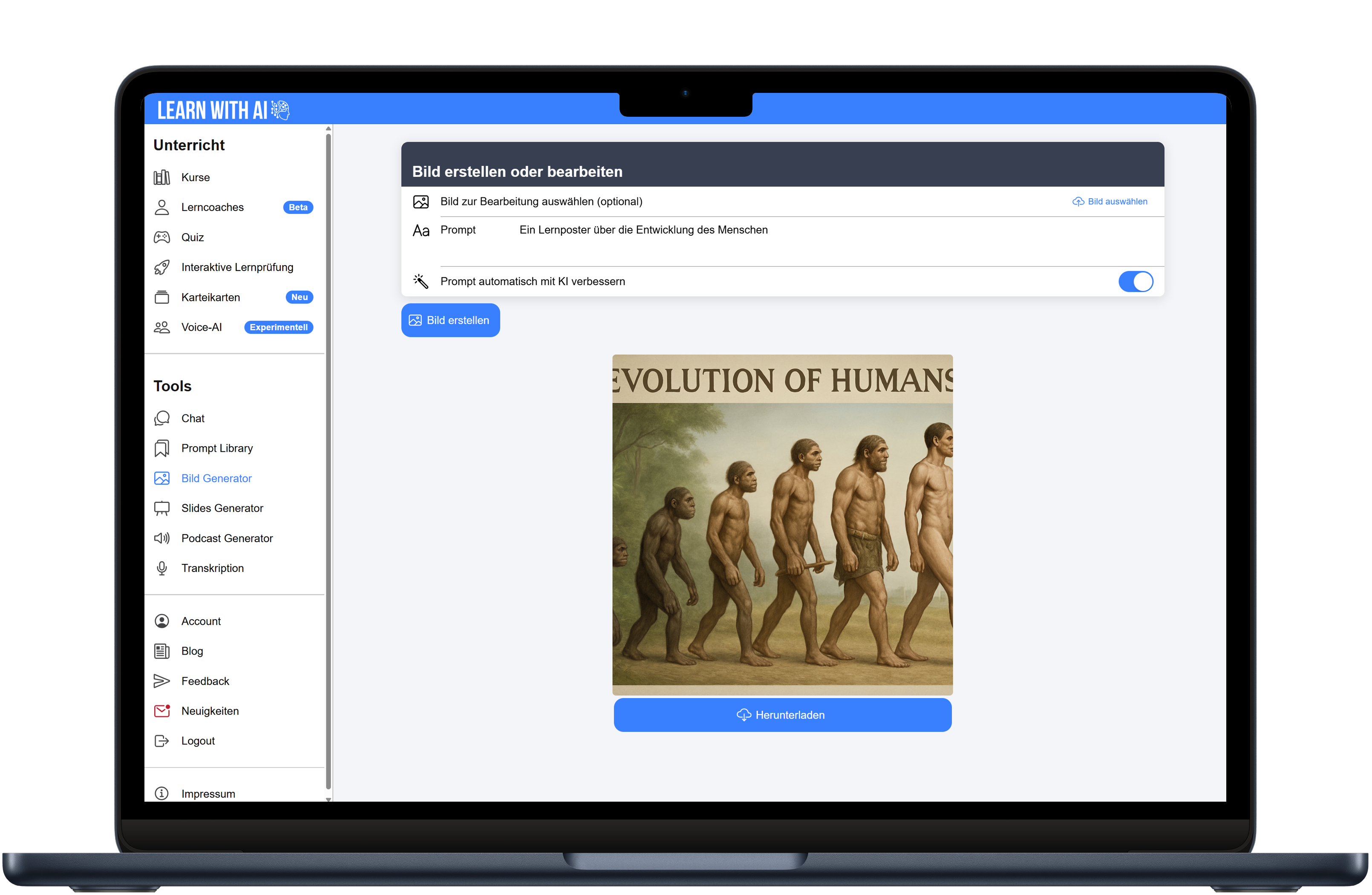 Mit unserer KI kannst du mit wenigen Worten ein passendes Bild für deine Unterrichtsunterlagen generieren. Dein Prompt für die Bilderstellung wird von unserer KI automatisch optimiert.