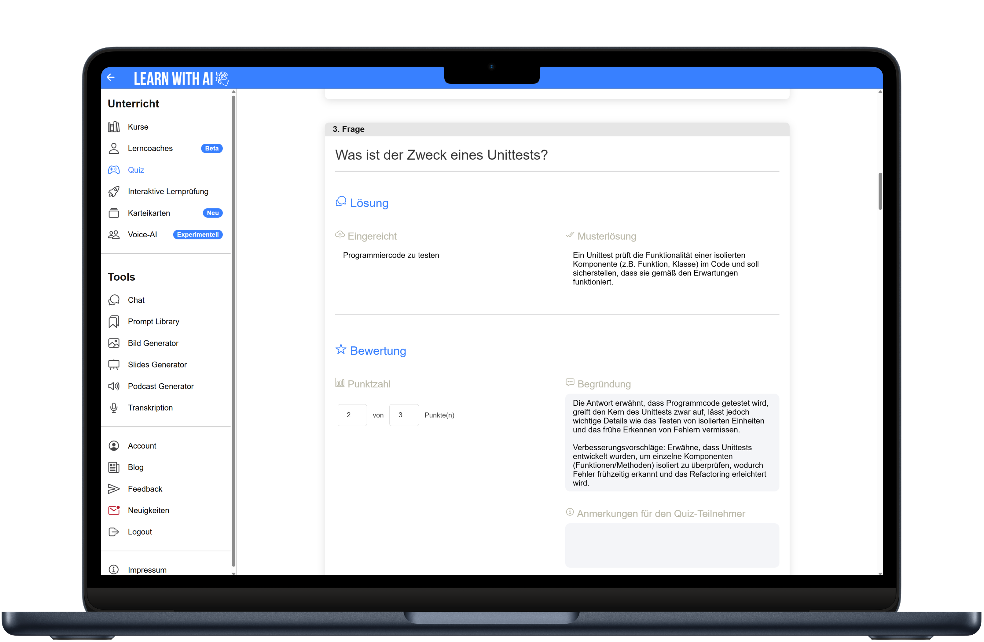Die Quizze von Learn With AI sind darauf ausgelegt, sowohl das Wissen zu testen als auch den Lernenden durch gezielte Rückmeldung zu helfen, ihre Schwächen zu erkennen und zu verbessern. So wird der Lernprozess unterstützt und individualisiert – alles auf Basis weniger Eingaben von dir.