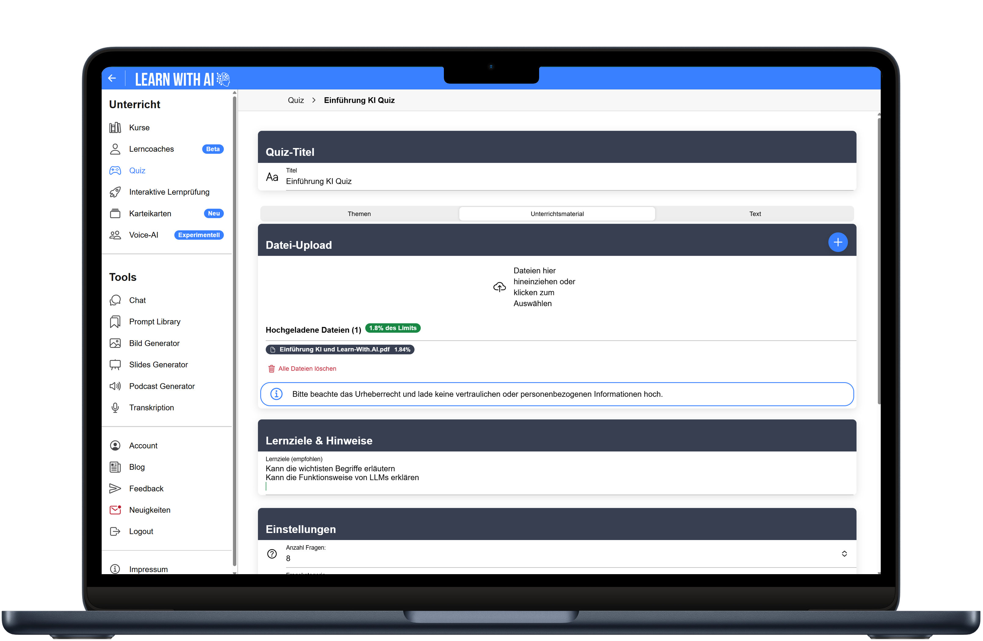 Mit Learn With AI kannst du in Sekundenschnelle massgeschneiderte Quizze erstellen – einfach das Thema oder ein PDF uploaden sowie die Lernziele vorgeben, und die KI generiert automatisch passende Fragen und Musterlösungen. Ob Multiple-Choice-Fragen oder offene Fragen zu spezifischen Themenbereichen – das System erstellt präzise Inhalte, die direkt in den Unterricht integriert werden können, und wertet die Antworten deiner Lernenden automatisch aus.